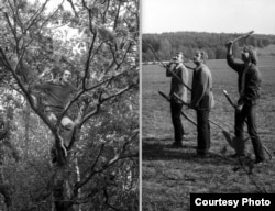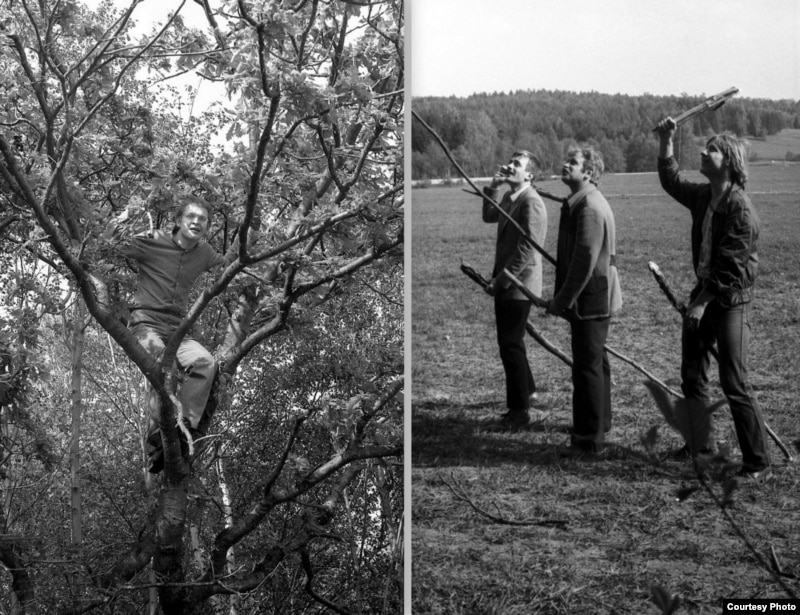 Гульня ў “салаўя-разбойніка” ў часе выезду разам са школьнікамі ў Вязынку, травень 1982 году. Вінцук Вячорка ў ролі “салаўя” на дрэве. У ролі рыцараў: аўтар, Сяржук Сокалаў-Воюш, Яўген Валасевіч.