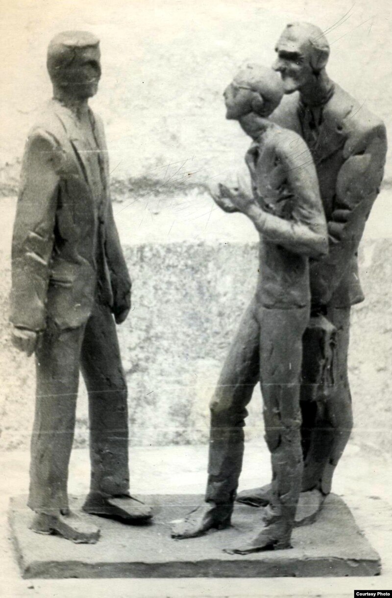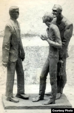Статуэтка працы Гэніка Лойкі “Майстроўская тройца”, на якой выяўленыя аўтар, Вінцук Вячорка і Сяргей Запрудзкі.