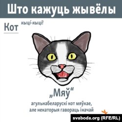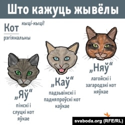 З жывёламі ўсё ня так адназначна. Напрыклад, кот. Стандартны агульнабеларускі кот мяўкае — кажа „мяў“. І гэта звычайна агульная назва розных відаў кацінага маўленьня (а іх шмат!) Але „мяў“ чуюць далёка ня ўсе беларусы.
