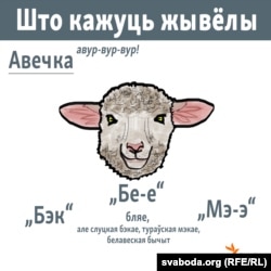 Сярэднестатыстычная беларуская авечка бляе — кажа „бе-е“. Але слуцкая бэкае, тураўская мэкае, а белавеская дык наагул бычыт. І падзываюць авечак па-рознаму: звычайна „авур-вур-вур“, але на ўсходзе — „шу-шу-шу“, ад Берасьця да Магілёва — „шут-шут-шут“, „шута-шута“, „шуткі-шуткі“, на Нарачы — „вуль-вуль“, на Віленшчыне — „куцý-куцý“.