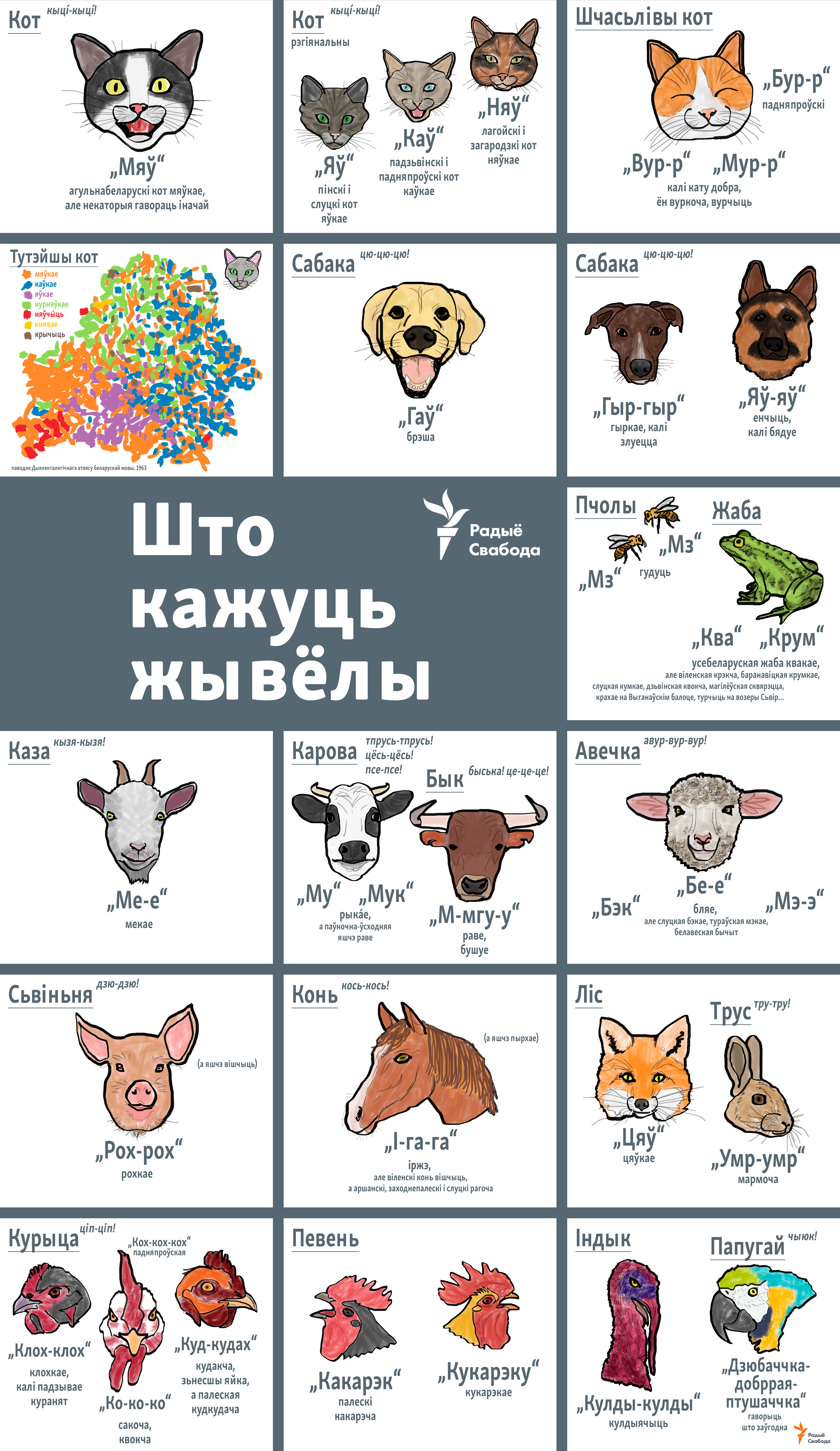 Карцінкі ніжэй — вынік вуснага апытаньня. Але не жывёлаў, а людзей. І не карэспандэнтамі Свабоды, а шматлікімі навукоўцамі, якія хадзілі па вёсках і мястэчках Беларусі. Вынікі апытаньняў тых навукоўцаў сабраныя ў кнігах — у Дыялекталягічным атлясе беларускай мовы (1963 год), у пазьнейшых Лексычным атлясе і слоўніках. Нядаўна Свабода публікавала „Моўныя мапы“ пра Каляды.