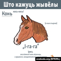 Конь адгукаецца на „косю-косю“ або на імя, кажа „і-га-га“. Гэта конь іржэ, але аршанскі, заходнепалескі і слуцкі конь рагоча, а віленскі вішчыць. А яшчэ конь часта нічога ня кажа, толькі пырхае (чмыхае, фыркае).