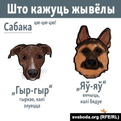 З сабакамі таксама ўсё проста толькі на першы погляд. „Гаў“ — гэта звычайны гук ад сабакі. Сабака брэша (таксама гэтак кажуць пра чалавека, які хлусіць). Падзываць сабаку найлепей па імені, але можна паспрабаваць і словамі „цю-цю-цю“.