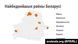 Гэта чвэрць раёнаў краіны. Глядзім, у якіх з гэтых раёнаў найбольш складаная эканамічная сытуацыя.