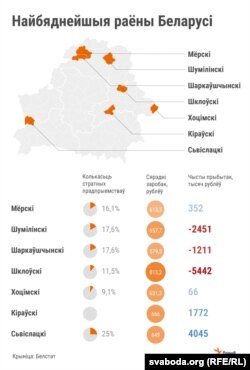 31 раён Беларусі старшыня Савету Рэспублікі Міхаіл Мясьніковіч называе «адсталымі ў пляне сацыяльна-эканамічнага разьвіцьця». Свабода паглядзела, што гэта за раёны, і вызначыла 7 з самымі вялікімі стратамі і нізкімі заробкамі.