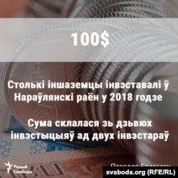 Нараўлянскі раён на Гомельшчыне ў параўнаньні зь іншымі выглядае няблага па заробку: 699 рублёў. Стратных прадпрыемстваў тут 9%. У 7 самых бедных ён не трапляе, але цікавы палітыкай прыцягненьня інвэстыцый. За 2018 год раён прыцягнуў 100 даляраў інвэстыцый. Як паведамілі Радыё Свабода ў кіраўніцтве райвыканкаму, такая сума склалася зь дзьвюх інвэстыцый у дзьве розныя арганізацыі.