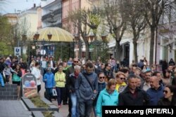 Празь нейкі час пратэстоўцы пайшлі калёнай па цэнтры гораду. Большую частку шляху ад плошчы Леніна да цэнтральнага ўнівэрмагу людзі ішлі бязь лёзунгаў, толькі некалькі разоў выгукнулі «Не заводу АКБ!».
