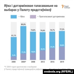 - Як сьцьвярджае ЦВК, яўка на выбары склала 77,22%. На трох мінулых выбарах у Палату называлася яўка каля 74%, а рэкорд быў у 2004 годзе, калі называлася яўка 89,84%.