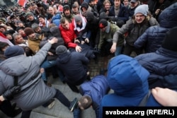 12:16 Сутычка на Кастрычніцкай плошчы. Удзельнікі пратэсту спрабуюць падняцца на прыступкі Палацу рэспублікі, але супрацоўнікі міліцыі і людзі ў цывільным не пускаюць нікога.
