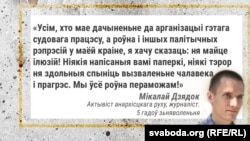 «Я толькі хачу падзякаваць сваім родным, сябрам, таварышам-анархістам, журналістам, праваабаронцам, усім неабыякавым, усім, хто шануе маю працу, за тое, што падтрымлівалі мяне на працягу гэтага году і дапамагалі матэрыяльна. Гэта вельмі важна для мяне.