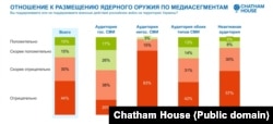 Падчас дасьледаваньня высьветлілася, што гэтае стаўленьне вельмі моцна залежыць ад таго, якімі інфармацыйнымі крыніцамі карыстаецца рэспандэнт: сярод тых, хто атрымлівае інфармацыю толькі зь дзяржаўных СМІ, праціўнікаў разьмяшчэньня ў краіне ядзернай зброі 58%, а сярод тых, хто карыстаецца толькі недзяржаўнымі мэдыя, такую думку маюць 97%.