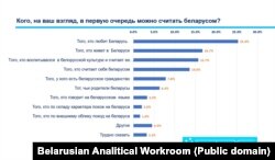 Найбольшую колькасьць набралі варыянты адказаў «любоў да Беларусі» і «пражываньне ў Беларусі». Аднак на трэцім месцы — адказ, які зьвязвае азначэньне з ангажаванасьцю ў беларускую культуру. Варыянт адказу «Той, хто гаворыць на беларускай мове» выбралі 3,3% апытаных.