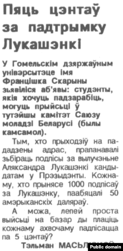 У сярэдзіне траўня ў «Свабодзе» выйшла нататка: у Скарынаўскім унівэрсытэце ў Гомлі студэнтам паабяцалі па 50 даляраў за тысячу подпісаў за вылучэньне Лукашэнкі. Карэспандэнт выканаў нескладанае арытмэтычнае дзеяньне — атрымалася па пяць цэнтаў за подпіс.