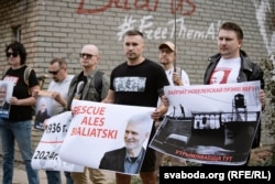 Алесь Бяляцкі ў зьняволеньні ўжо больш за 3 гады — яго арыштавалі 14 ліпеня 2021 году і асудзілі на 10 гадоў калёніі. У руках пікетоўцаў, якія прыйшлі да «муралу Бяляцкага», сярод іншых плякатаў былі і тыя, на якіх па-ангельску было напісана: «Уратаваць Алеся Бяляцкага».