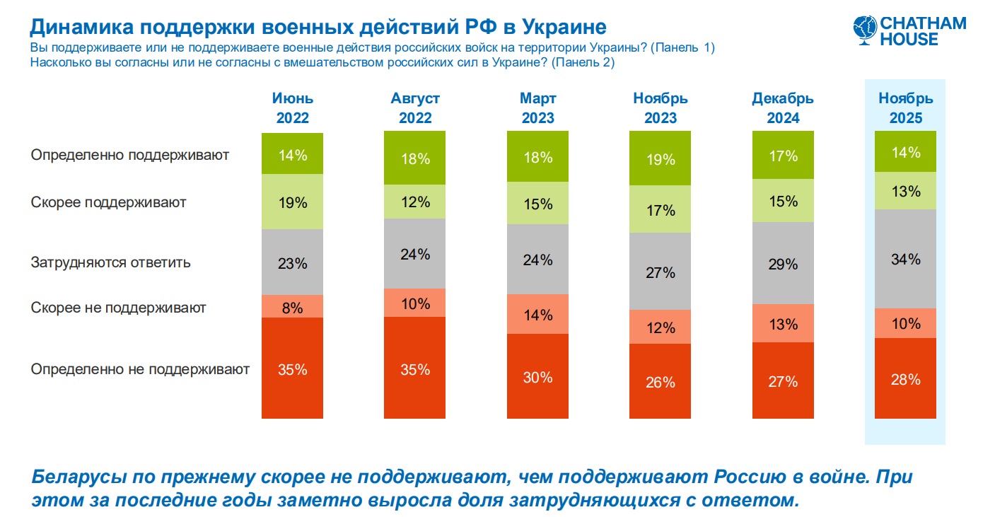 — Вы адсочвалі стаўленьне да ваенных дзеяньняў Расеі ва Ўкраіне з чэрвеня 2022 году. Каля 30% апытаных — на баку Расеі ў вайне. З папярэдняга графіка вынікае, што за саюз з Расеяй — заўважальна больш. Як гэта спалучаецца? Нямала людзей, якія за саюз з Расеяй, вайну якой яны не ўхваляць?